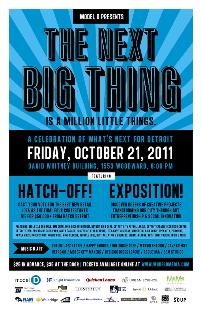 To celebrate the big power of small ideas, Model D proudly presents a first-ever showcase of what’s next for Detroit. On Friday, Oct. 21 at the vintage 1914 David Whitney building in downtown Detroit, Model D will bring together the very best of local art, music, food, culture and entrepreneurship for a tribute to the creative spirit alive and well (nay, bursting at the seams) in our city.