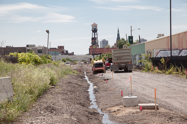 “We would never build roads like that today,” Clein says, referring to Detroit’s many excessively wide surface streets. But these roads, especially the spokes issuing from downtown (Fort, Michigan, Grand River Avenue, Woodward, Gratiot, and Jefferson), which are in some cases nine lanes wide, have ample room for automobiles, parking, and bike lanes.