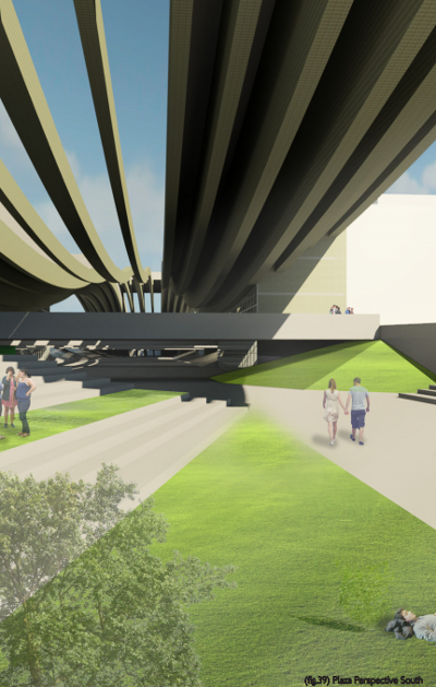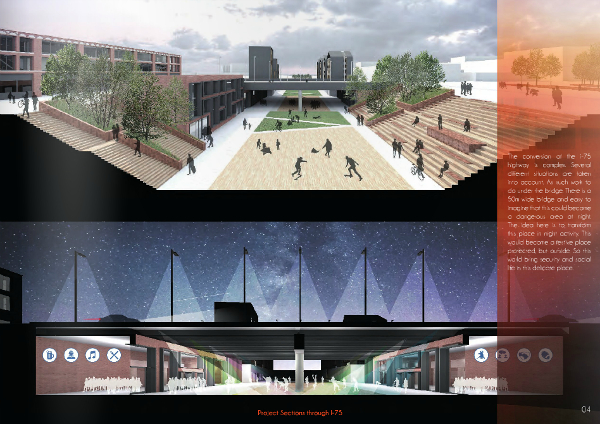 At 20 feet deep, 375 is also deep enough to be interesting. The sloping medians and spaces under bridges, overpasses, and ramps provide an interesting opportunity for performance space, and other areas for active and passive recreation, totally unique to the city (see William Stonehouse rendering). The same French students above also envisioned a series of stepped plazas where the grass currently slopes, perfectly sized to sit and read a book, or watch a performance. Under bridge space could be similarly converted to covered performance space and/or vendor space, or for a restaurant or biergarten…or for a special once-a-year event, like Movement.