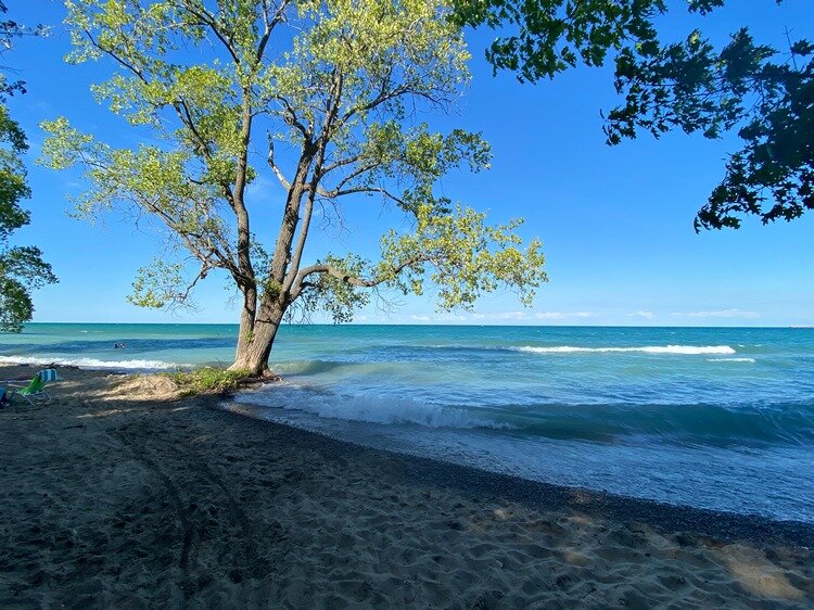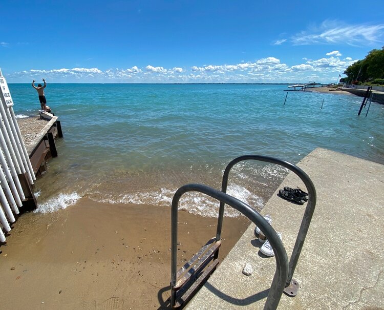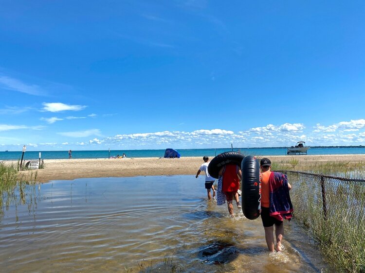Kraft Road Beach has an adventure built into it: Getting to the beach this year requires a short trek through an ankle-deep puddle between the grassy park area and Lake Huron. On a hot day, it’s a nice cooldown mid-walk. This access point is only a few hundred feet north of where the Black River Canal meets Lake Huron. This canal feels very tropical with birds chirping and gorgeous Caribbean-like blue waters that are great for paddle sports.Â
