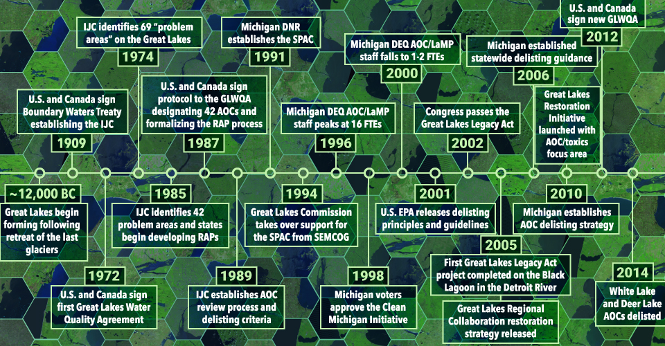 In 1987, 43 “toxic hot spots” around the Great lakes were designated as “Great Lakes Areas of Concern” (AOCs) by the United States and Canada under the binational 1987 Great Lakes Water Quality Agreement. Fourteen of those areas were in Michigan.