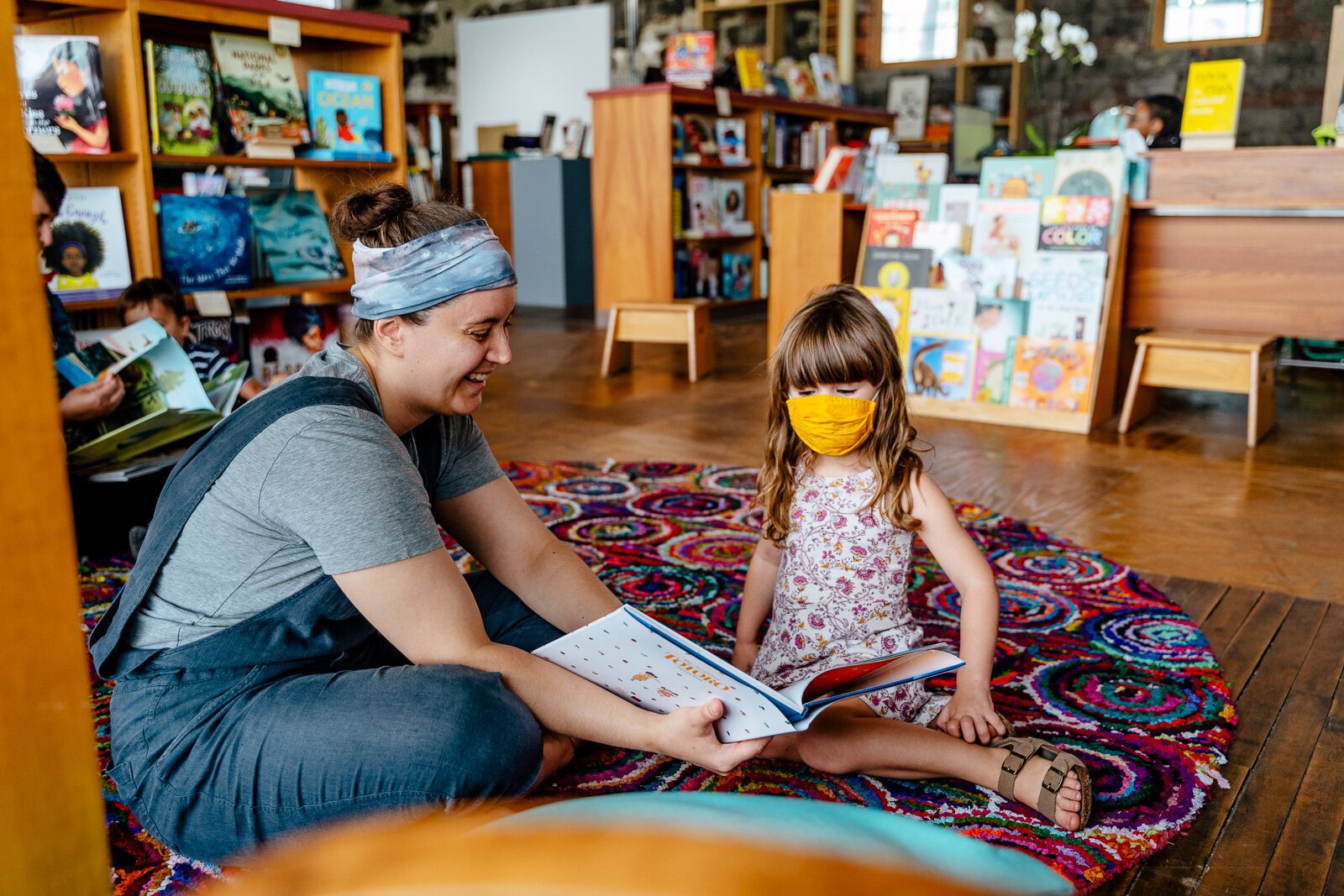 Nick Hagen – Co-owner Erin Pineda reads with a neighbor during storytime