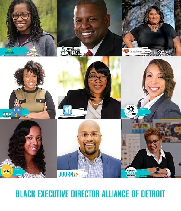 The Black Executive Director Alliance of Detroit includes Tiffany Brown, founder and executive director of Developing Despite Distance; Reneé Fluker, founder and president of the Midnight Golf Program; Richard Grundy, co-founder and CEO of JOURNi; Anise Hayes, founder and executive director of Atlantic Impact; Kiesha Jackson, founder and executive director of Caleb’s Kids; Kim Johnson, founder, president, and CEO of Developing K.I.D.S.; Eric Miller, founder and president of The Lawn Academy; Courtney Smith, founder and CEO of Detroit Phoenix Center; and Nicole Wilson, executive director of The Yunion.