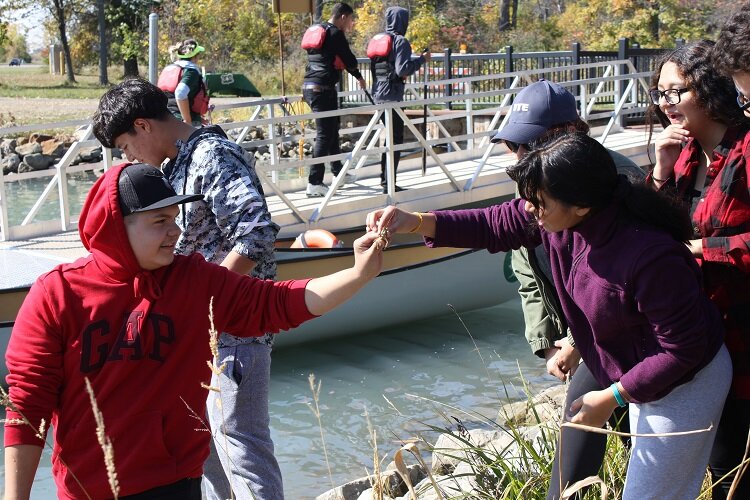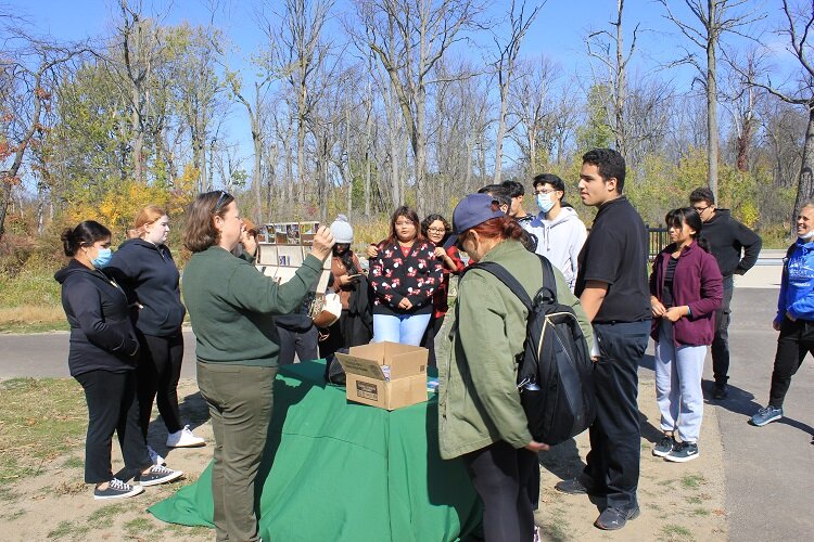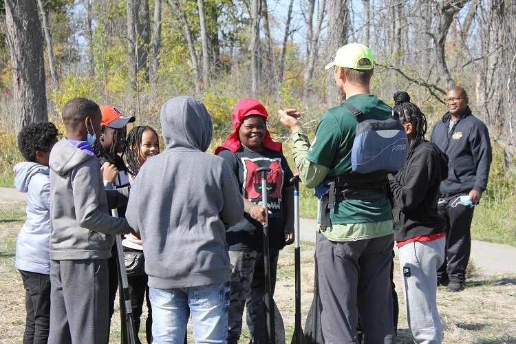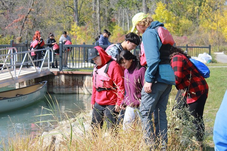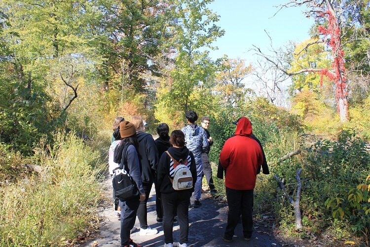 Along with time in the canoes, the program includes land-based “stations,” where kids learn about topics such as water safety, watersheds, water quality, and plants and trees. At one station, this group learned about public lands from Lisa Perez, Detroit Urban Connections coordinator with the U.S. Forest Service. She explained to the students that public lands belong to them, and then she led the group on a short hike, pointing out interesting facts about what they saw. Some of the kids stopped to take photos of the brightly colored trees.