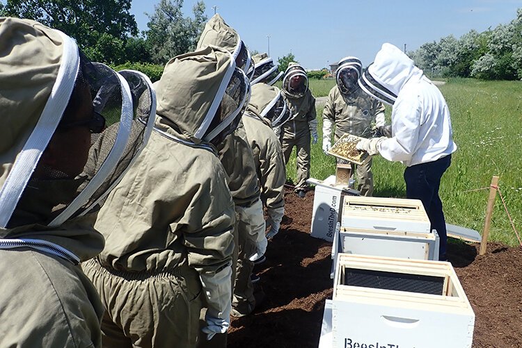 Bees in the D maintains apiaries at Oakland University, University of Detroit, and Martin Luther King Jr High School and have installed four hives and an interactive exhibit at the DNR Outdoor Adventure Center to help teach young students. They even have child-size bee suits for students to visit hives.