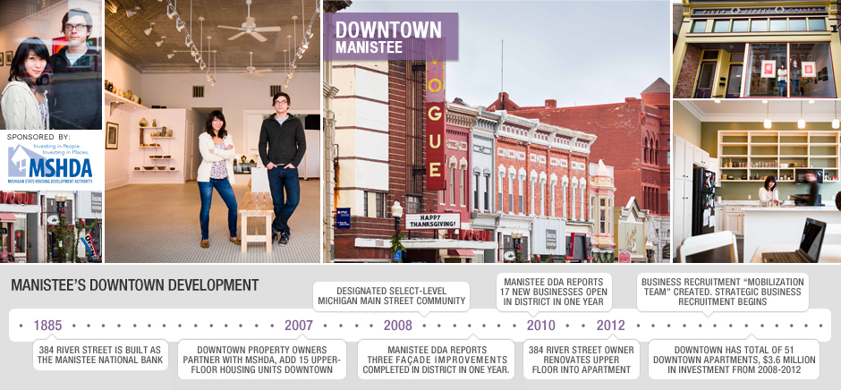 That’s a trend Manistee has been watching unfold for some time. In 2007, the City of Manistee and Manistee DDA partnered with the Michigan State Housing Development Authority (MSHDA) and downtown property owners to renovate 15 rental units. Since that time, the Manistee DDA has accumulated a net gain of 12 new businesses and recorded $3.6 million in public and private investment.