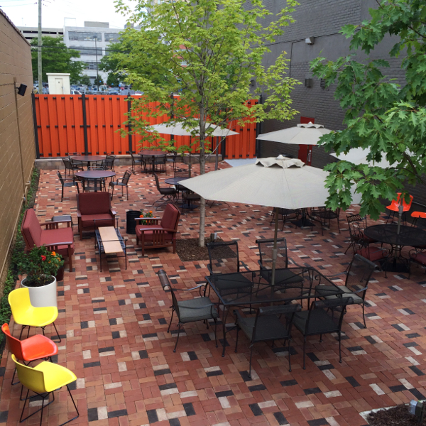 The patio area, once an old asphalt parking lot, now features brick pavers, outdoor furniture, and three young trees — an oak, a maple, and a poplar. At night, soft lighting and an outdoor speaker system complement the vibe found inside the lounge itself.