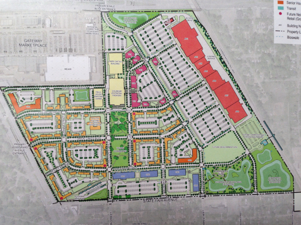 Though nothing has been formally adopted, the latest plan released by the developers is the most detailed to date, offering the public a glimpse into a 157-acre site that includes 650 residential units made up of a mix of one- and two-bedroom townhomes, apartments, studios, and lofts. The plan also calls for senior housing, retail, office space, green space, pocket parks, and transit-oriented development.