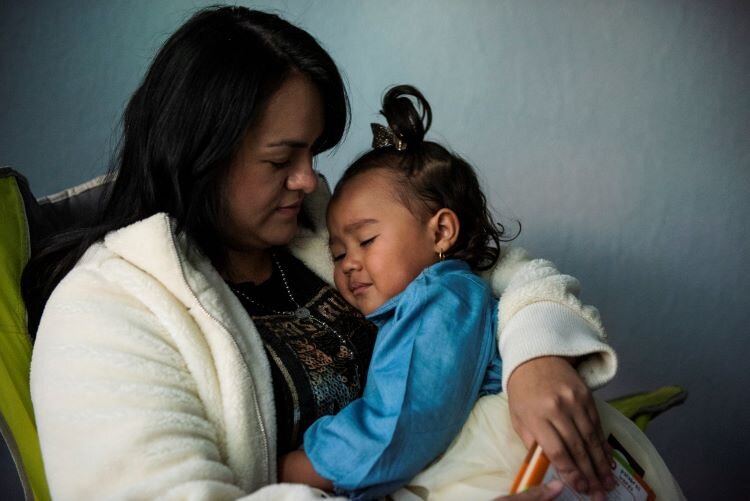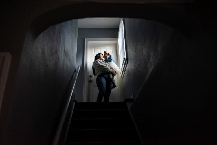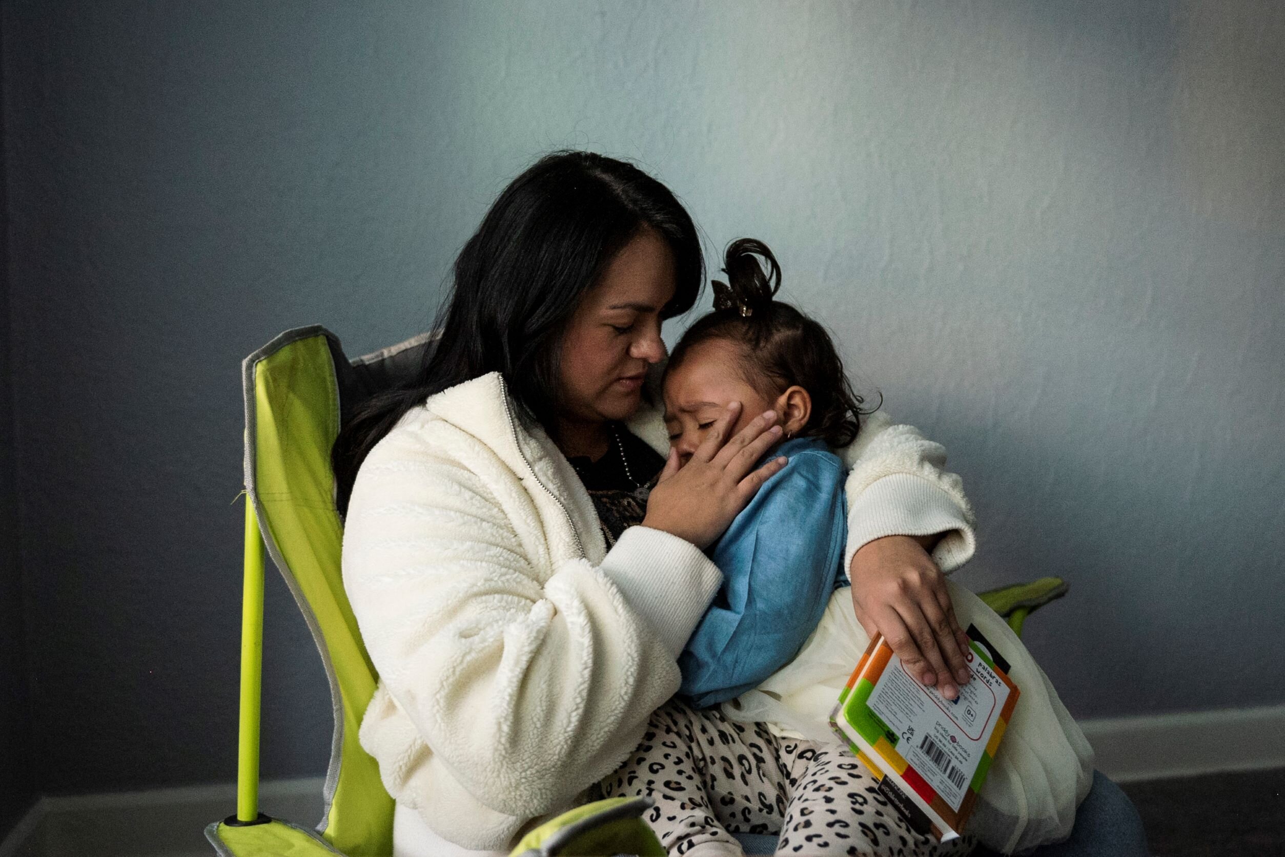 Lauren burrows her head into her mother’s chest. She’s timid, Cruz says. The two spend every day at home together while her husband works. The couple has one car, and she has yet to learn to drive in Michigan, something she hopes to do soon. As her daughter’s first teacher, she helps her practice her colors, numbers, letters, and vowels. Lauren draws and paints on a tablet and “cooks” in her play kitchen. Together, they watch videos online to help them learn English.
