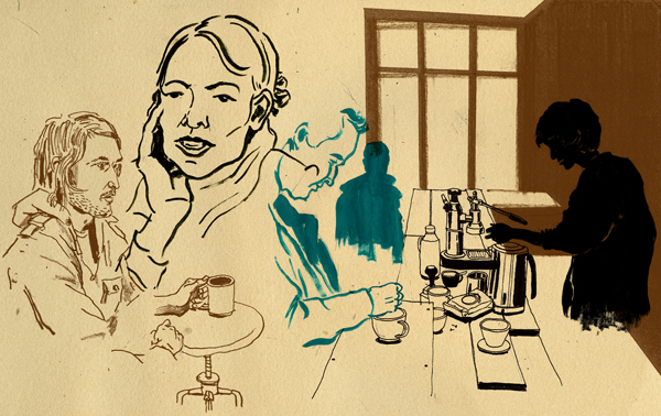 A pair of tattooed men in a leather jackets sit on chairs by the front windows. One is starting a band called Mexican Knives; the other has just landed a steady DJ gig at St Andrew’s. It’s about 4 p.m. and most of us have finished up work to come drink afternoon coffees.