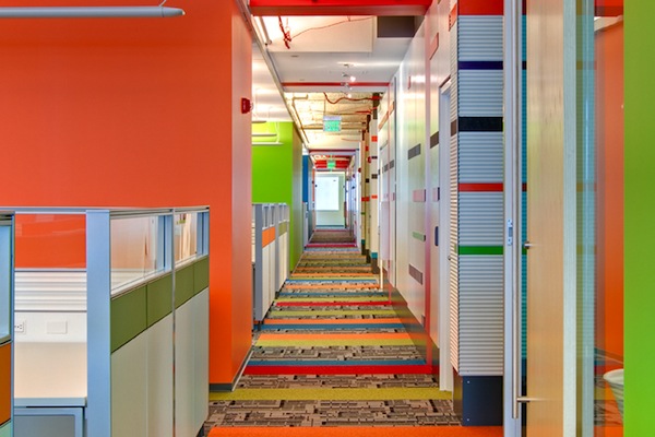 The spaces in question, in the newly renovated old National Bank of Detroit Building (now called the Qube) are full of flamboyant colors, eclectic furniture and complex spaces.