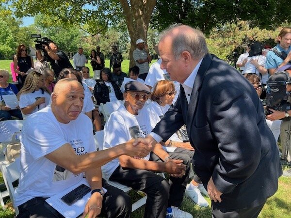 Fred Temple’s family, wearing T-shirts with his face on the front, embraced each other during the ceremony and offered comforting words to the families and survivors. Fred Temple’s nephew, Tyrone Temple, prayed over the park and urged everyone to continue working to bridge societal gaps caused by differences, to help prevent race wars and retaliations. Temple noted that although his father was deeply hurt by the passing of his younger brother Fred, he was not raised to harbor hate. His hope is that the marker sheds light on the truth and helps spread the message of unity.