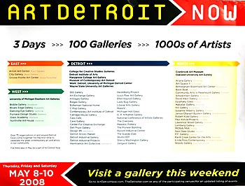 The group that emerged from those early meetings has launched its own ambitious wide-ranging unification project called Art Detroit Now. Their first major initiative is a three-day series of interconnected openings and special events at 100 metro Detroit galleries and museums that starts this Thursday. The official kick off came in April at a crammed schmoozefest at Cass Cafe. Key players from major institutions (Detroit Institute of Arts, Cranbrook Art Museum, College for Creative Studies, Oakland University, MOCAD and others) mingled with DIY upstarts from Bohemian National Home, the Center for Creative Exchange and Russell Industrial Center.