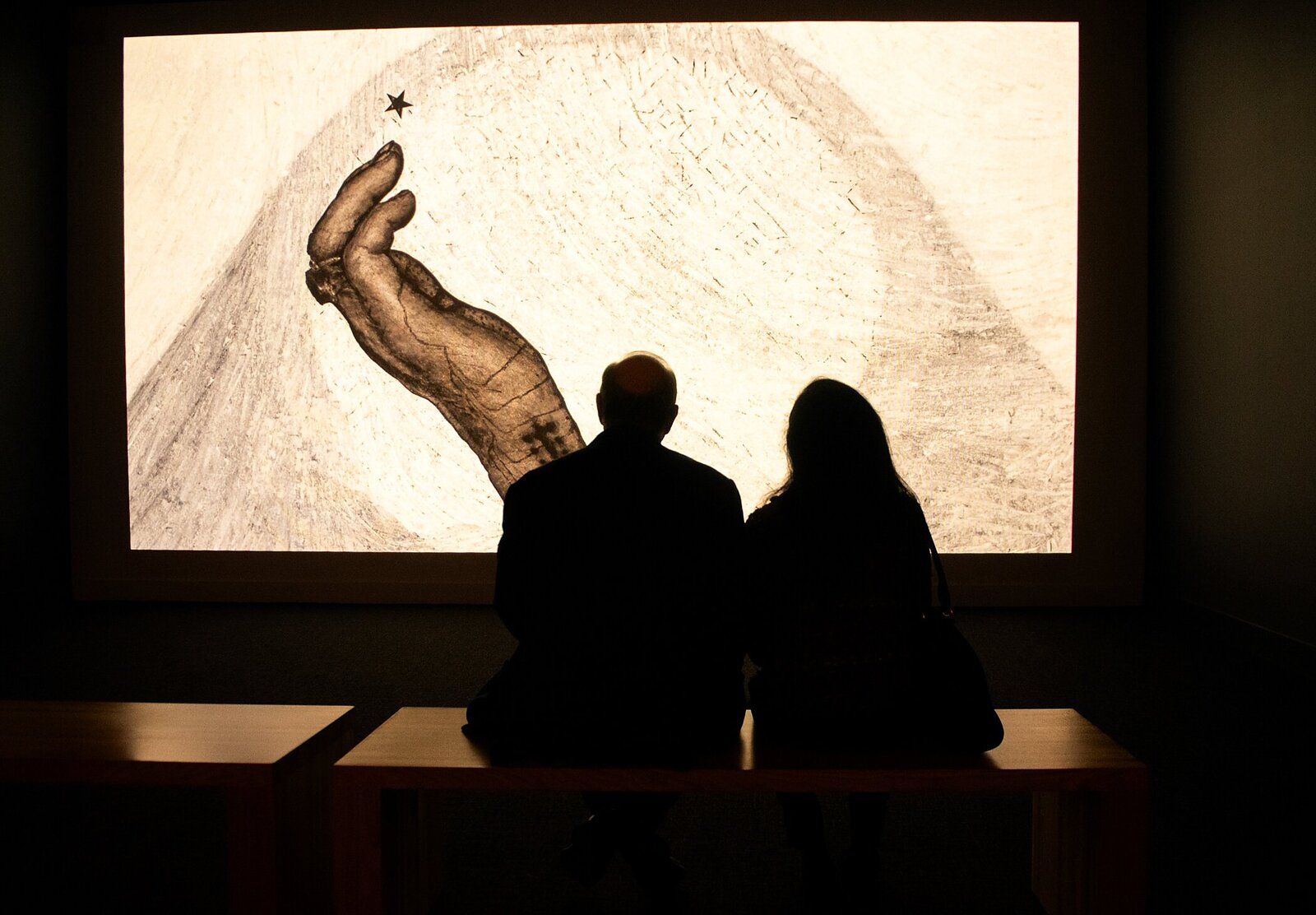 At the end of the exhibit is a contemporary multimedia installation by Iraqi-born artist Sadik Kwaish Alfraji titled, “A Thread of Light Between My Mother’s Fingers and Heaven”. The work is rooted in the artist’s memories of his mother, her homemade bread, and family meals in Baghdad. The work evokes feelings of comfort, love, and nostalgia.