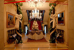 pine trees and antique ornaments greet long lines of visitors on tour
