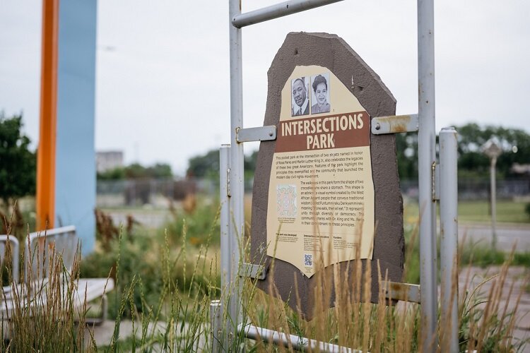 One of the most eye-catching spaces , however, is Intersections Park. Located at the corner of Martin Luther King Jr. and Rosa Parks Boulevard. It was developed by the Heritage Works nonprofit with the input of local residents and stakeholders and completed in 2016. Once a site used for illegal dumping, Intersections Park now features colorful pillar sculptures, benches decorated with inspiring words, and a path shaped in the likeness of two overlapping crocodiles, a west African symbol that urges unity.