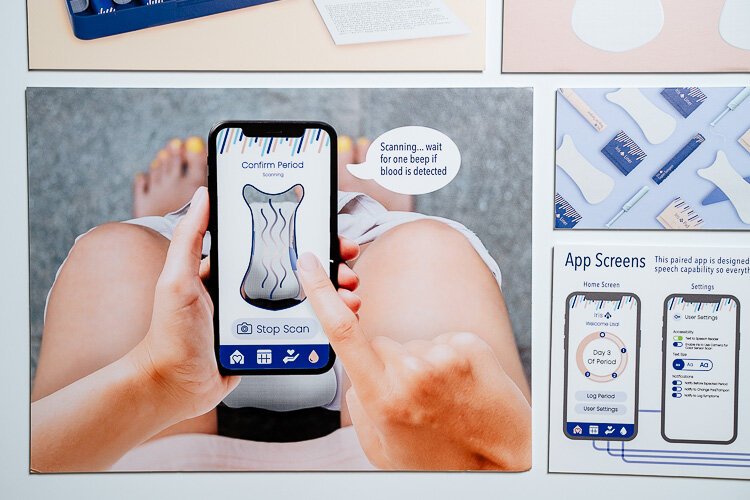 After realizing this additional roadblock in blind women’s experiences, Baker took her design a step further. She still designed pads and tampons with Braille on them, indicating the product type (pad, liner, or tampon) and the absorbance level. Additionally, she prototyped an app that uses your phone’s back camera to detect if there’s blood on your underwear, or not. The app also has built-in accessibility functions like a text-to-speech reader and notifications of an expected cycle start date, notifications to change the product, and ways to log symptoms.