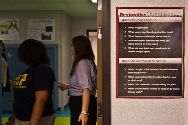 In Highland Park, for example, a teacher who was trained in Restorative Practices, but who was initially skeptical, had a class that was quickly spiraling out of control. She decided to try the process, creating a circle and sharing how the students’ behavior made her feel. She asked the students to answer a series of restorative questions, the last asking what needed to happen to make things better. The students came up with their own classroom guidelines. By using a fair process, and engaging students in the decisions, her discipline issues were done from that point forward.