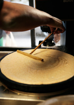 Aside from crepes, she sells fair trade organic coffee for a buck a cup, and that’s about it.
