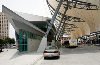 The Center may also help automobile and pedestrian travelers because its dramatic fabric canopies are certain to become a Downtown landmark that will help them find their way. The soaring structures also can be lit with changing colored lights.