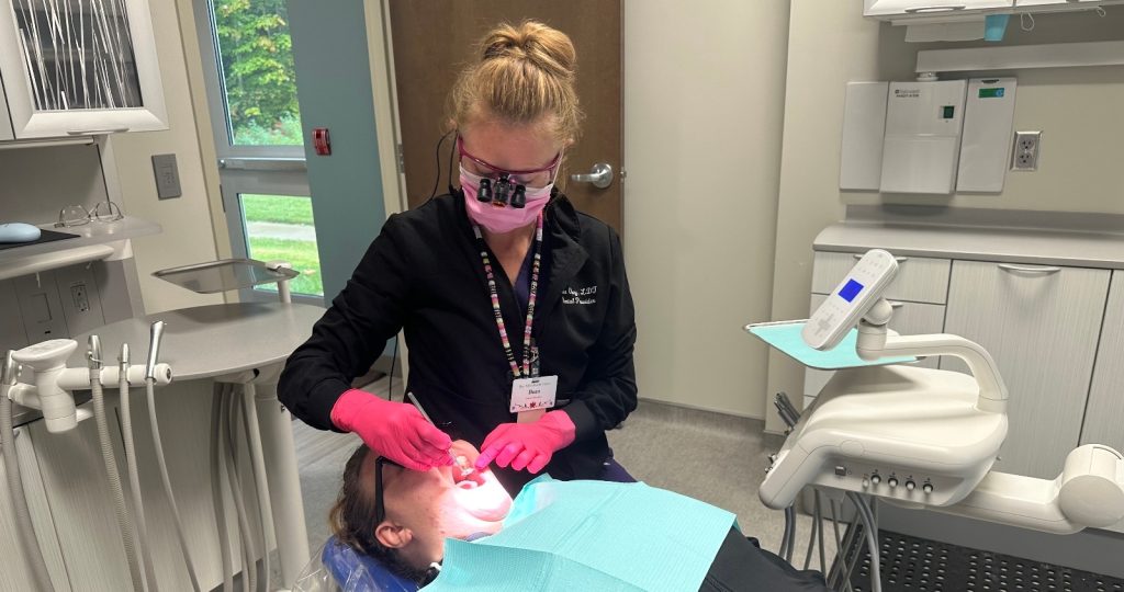 Dana Obey works with a dental patient.