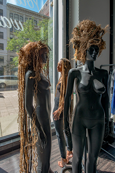 Roslyn Karamoko is a relative newcomer to the local fashion scene. She moved here three years ago and founded Detroit is the New Black, a brand, boutique, and “retail experience” located in downtown Detroit. The shop houses her own line of t-shirts, a curated collection of local and national designers, and a gallery space where she hosts community events such as open mics and painting classes.
