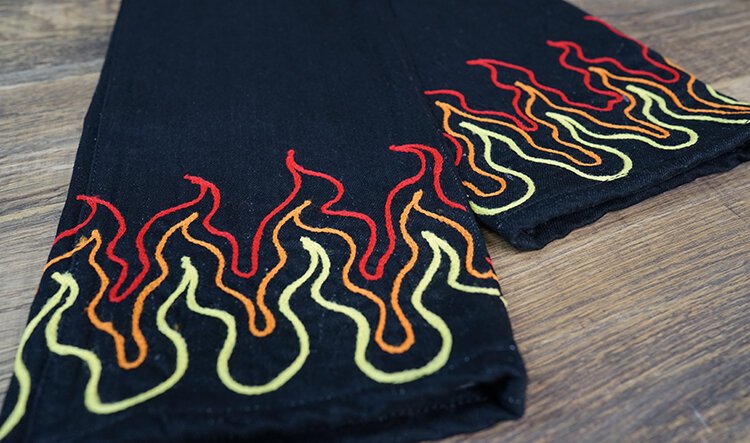 Ultimately, Johnson and the co-owners of Detroit Denim settled on the concept of flames — a motif that not only worked with the machine’s configuration, but also conveyed a classic aesthetic that complemented Detroit Denim’s old-school quality craftsmanship.