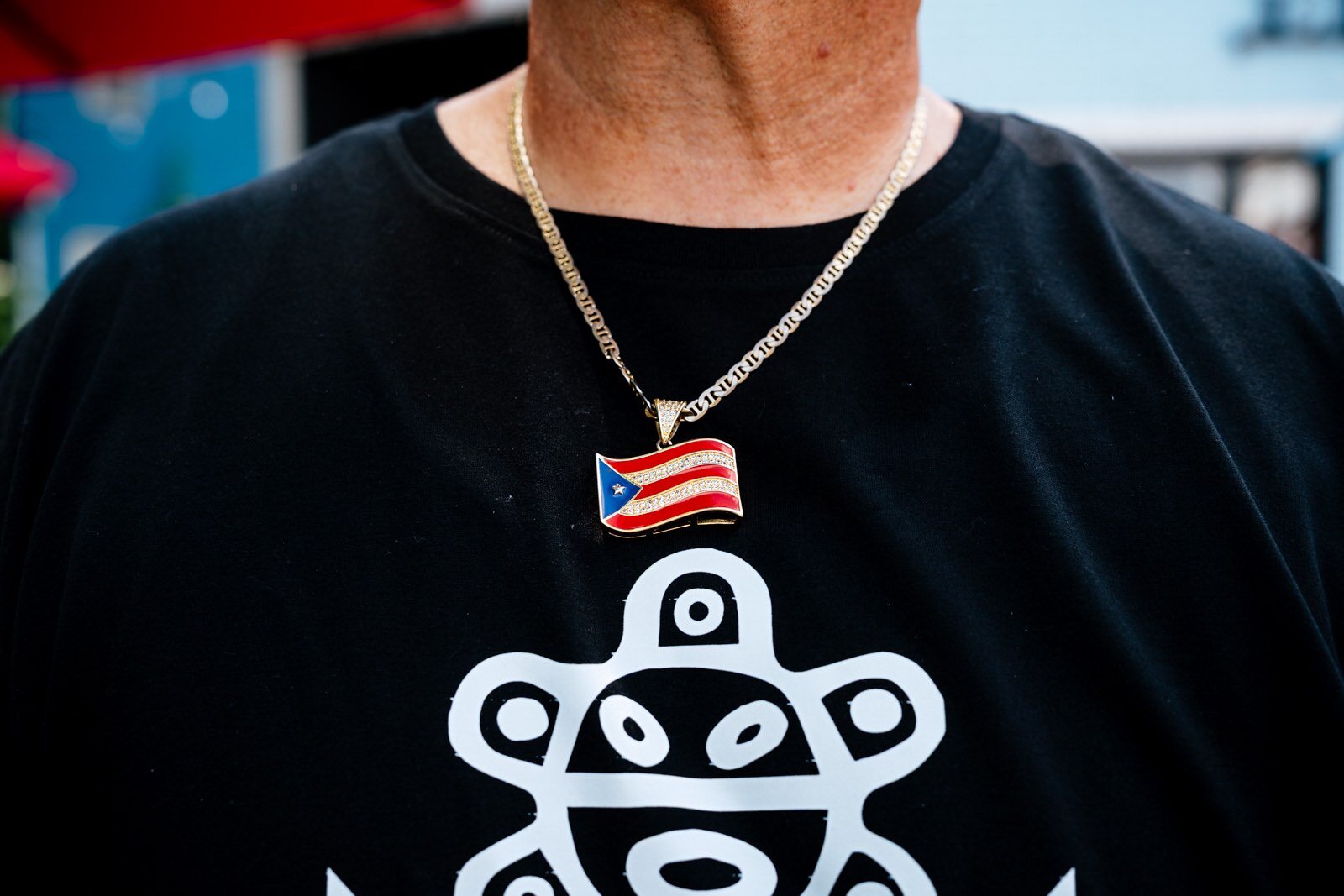 Nick Hagen – Alberto Ruiz, owner of El Amanecer in Ecorse, wears a medallion of the Puerto Rican flag