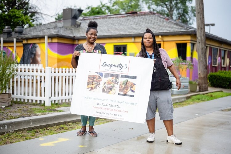 Cawana and Nina Bradford of Longevity Vegetarian cuisine hold up a sign advertising their business.