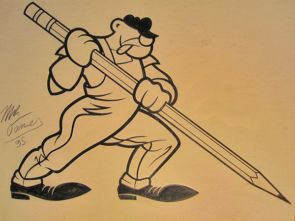 Illustration above is a detail from an untitled triptych by Southwest Detroit artist Mark Dancey devoted to the creative working life. The piece stares down at the editor’s desk as he sits down to work each day.