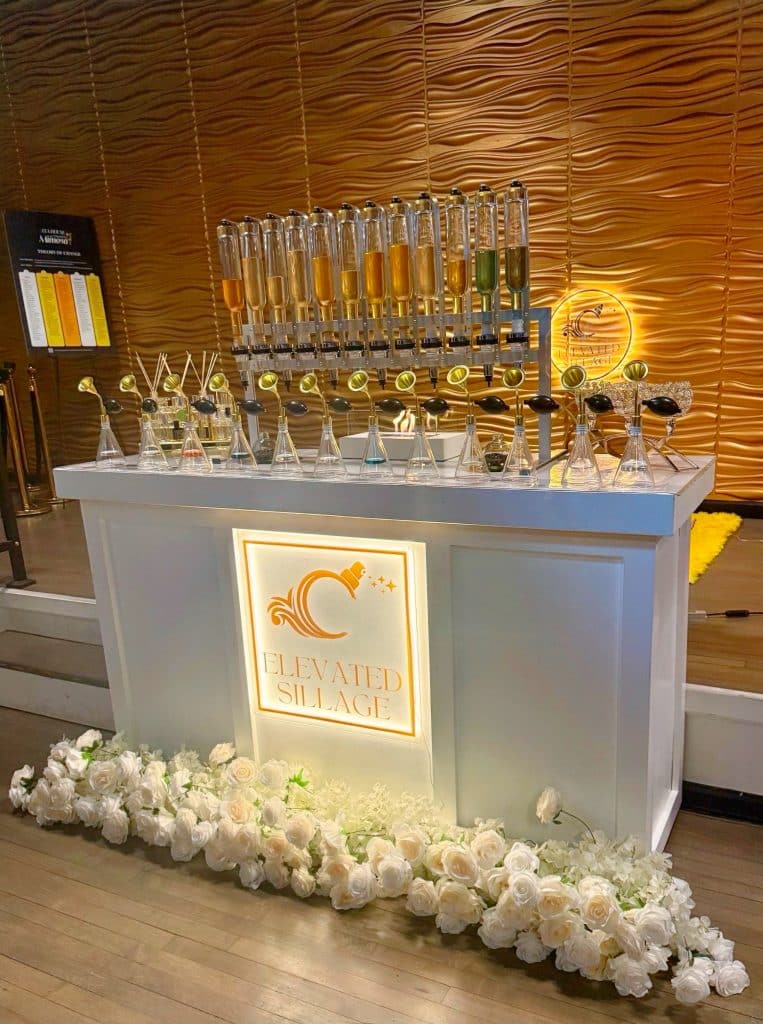 Sillage, a French term that describes the scent trail a perfume leaves behind, is at the heart of the concept. “I chose Elevated Sillage because the scent trails of your custom perfume will always hold an elevated memory in your mind about the event or business every time you spray it,” said Darby.