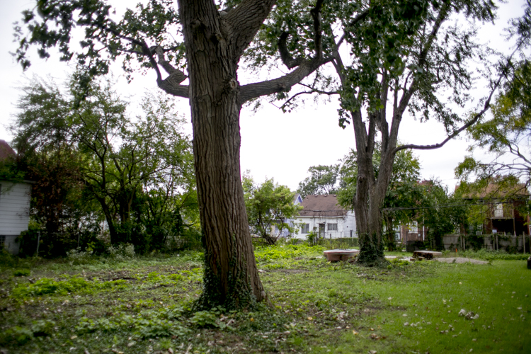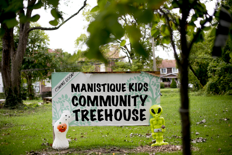 A blue sign stands in the middle of the land located at 223 Manistique Street on Detroit’s eastside. Written in white, it reads “Manistique Kids Community Treehouse.” Grazed by the first fallen leaves of autumn, a maple and cottonwood tree stretch out from the ground, high above the neighboring homes and into the cloudy afternoon sky.