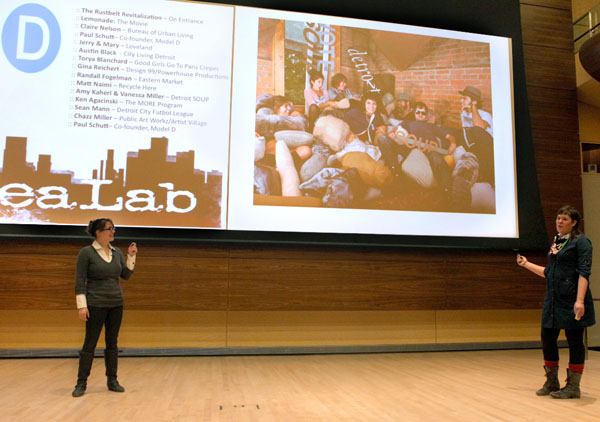Presenters included Jerry Paffendorf and Mary Lorene Carter of LOVELAND and Imagination Station; Austin Black of City Living Detroit; Gina Reichert of Power House Productions; Randall Fogelman of Eastern Market Corporation; Matthew Naimi of Recycle Here; Amy Kaherl and Vanessa Miller of Detroit SOUP; Ken Agacinski of the MORE Program; Sean Mann of Let’s Save Michigan; and Miller. Claire Nelson of Bureau of Urban Living opened the session and Paul Schutt of Issue Media Group shared the mission of Model D.