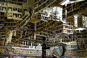 Polaroid snapshots hang from the ceiling. The hanging pictures are of
