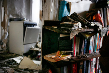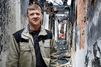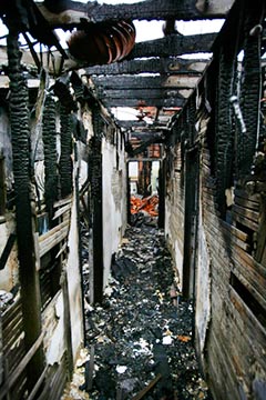 Chain link fencing erected around a burnt building usually means a