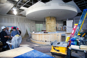 “Everything that can be restored is being restored,” says Bill Aprill, the hotel’s director of sales, as well as a knowledgeable and enthusiastic tour guide. He’s proud to point out not only the staircase, but the exterior marble and brick – cleaned by hand – beautiful tile floors currently masked by construction dust and historic paint schemes that are being recreated.