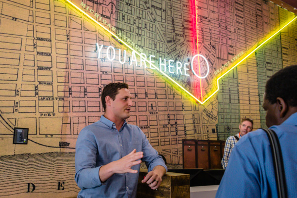1: Day one included field trips to tech incubators and start-up resource hubs Bizdom, Detroit Labs, Grand Circus, and Detroit Venture Partners, all located within the Madison Block, downtown Detroit’s startup neighborhood. The “You Are Here” sign can be found at the entrance to the historic Madison Building.