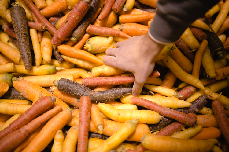 Brandon Seng inspects a rainbow of Michigan-grown carrots.