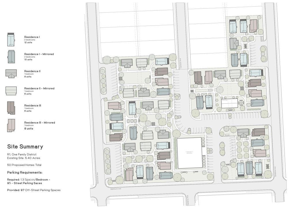 Micah 6’s solution was to create the Emerson Housing Development, a “pocket neighborhood” of 50 homes reserved for sale to older adults making 80-120% of the area median income. Yoakum says Micah 6 is considering several methods to ensure that housing costs would represent no more than 30% of a resident’s income, a common benchmark for housing affordability. The homes would be small – 700 square feet or less – and the development would include communal spaces including community buildings, courtyards, and seating areas.