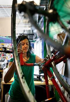 Everywhere. By day, she uses her urban planning background in her role as vice president of the New Center Council, a community development corporation in a busy neighborhood at the northern edge of Detroit’s downtown. By evening and weekend, she is co-owner of Wheelhouse Detroit, the bike shop that opened last year on the city’s recently developed RiverWalk along the Detroit River. A day in Detroit for Karen is never the same, but wild variety and randomness are why she loves this city.