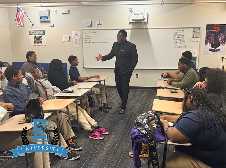 Anthony Thompson II is seated at a desk at Cornerstone Lincoln-King High School where he teaches a multifaceted entertainment-based curriculum. Thompson and his staff of 12 instruct over 5,000 students each week in topics such as studio engineering, drone piloting, podcasting, and the principles of the entertainment business. It’s known as Entertainment University.