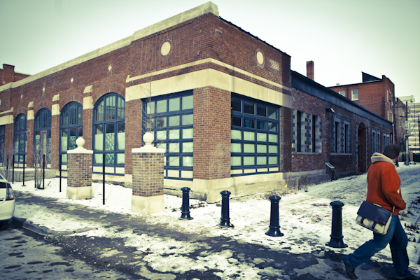 A staircase to the front mezzanine and rooftop was constructed from old steam pipes by Dormouse; the wall that backs it was made from scrap wood. On the south end of the building, opening up to the Green Alley, a greenhouse has been built with old windows sourced from the Green Garage, Dalgleish Cadillac and the Ottawa Power Station in Lansing.