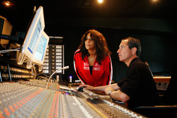 Mark Pastoria working with Kim Sledge, of Sister Sledge, on the final mix of her upcoming release.