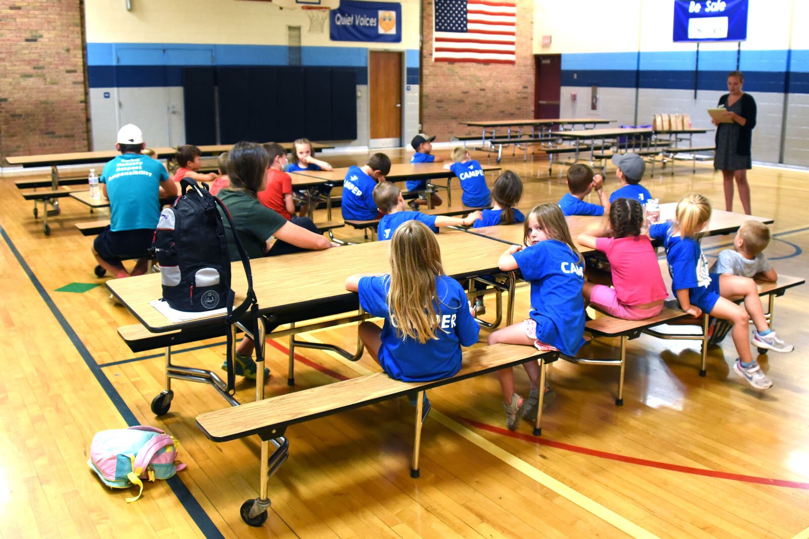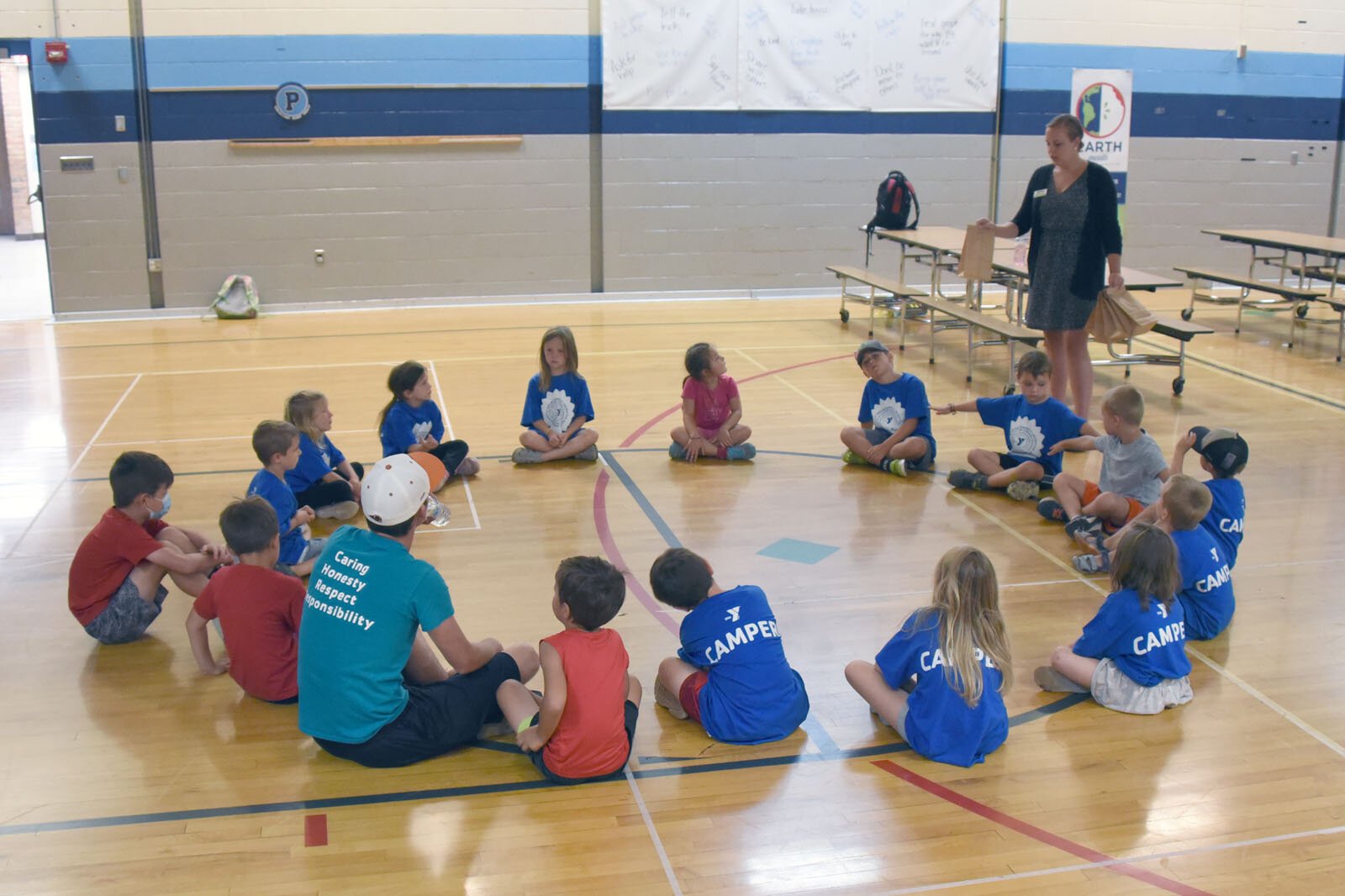 Health Department of Northwest Michigan Community Health Coordinator Kirstyn Horan speaks to children at the YMCA summer day camp at Petoskey's Ottawa Elementary School.