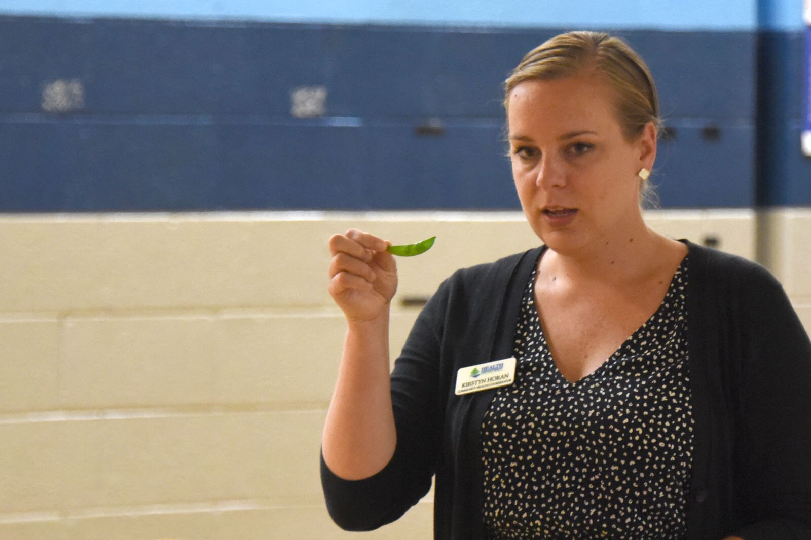 Health Department of Northwest Michigan Community Health Coordinator Kirstyn Horan speaks to children at the YMCA summer day camp at Petoskey’s Ottawa Elementary School.