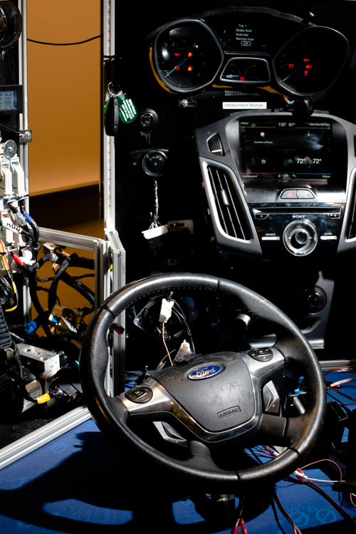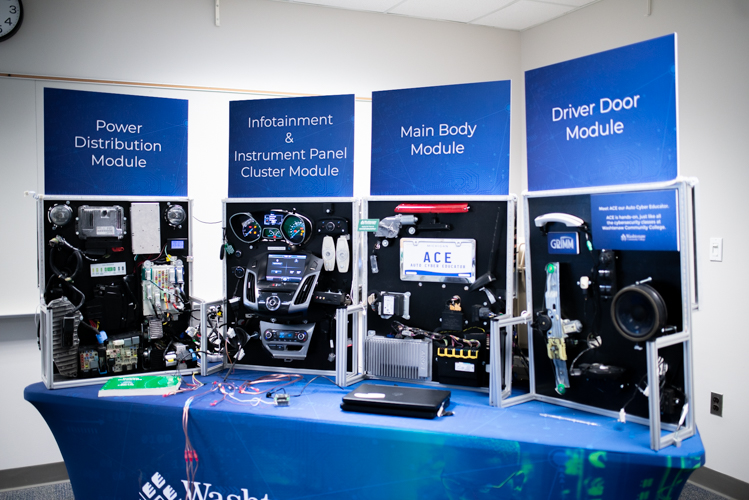 Steve Koss – This is the “mobile hacking workbench,” a replica of the communication computers and wiring infrastructure of a modern vehicle, custom-built for Washtenaw Community College.
