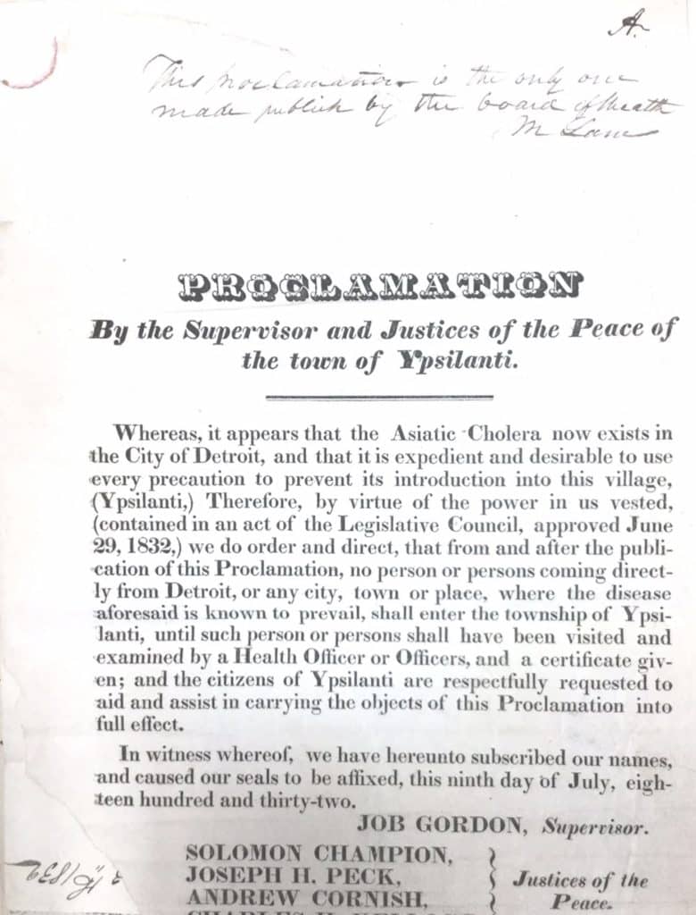 Cholera first hit Detroit in 1832 and it terrified Detroiters. In turn, the city took some precautions. Officials ordered that streets be swept and garbage removed. Pools of standing water were drained. Residents were ordered to purify their houses. But many attempted to flee the city. Usually unsuccessfully. As far away as Monroe, towns and villages began banning Detroiters from their borders. None took greater steps than Ypsilanti, who sent armed men to the roads leading into town. At one point, a group of deputized Ypsilanti residents shot at a postal worker, killing his horse, and committing a federal crime in the process.