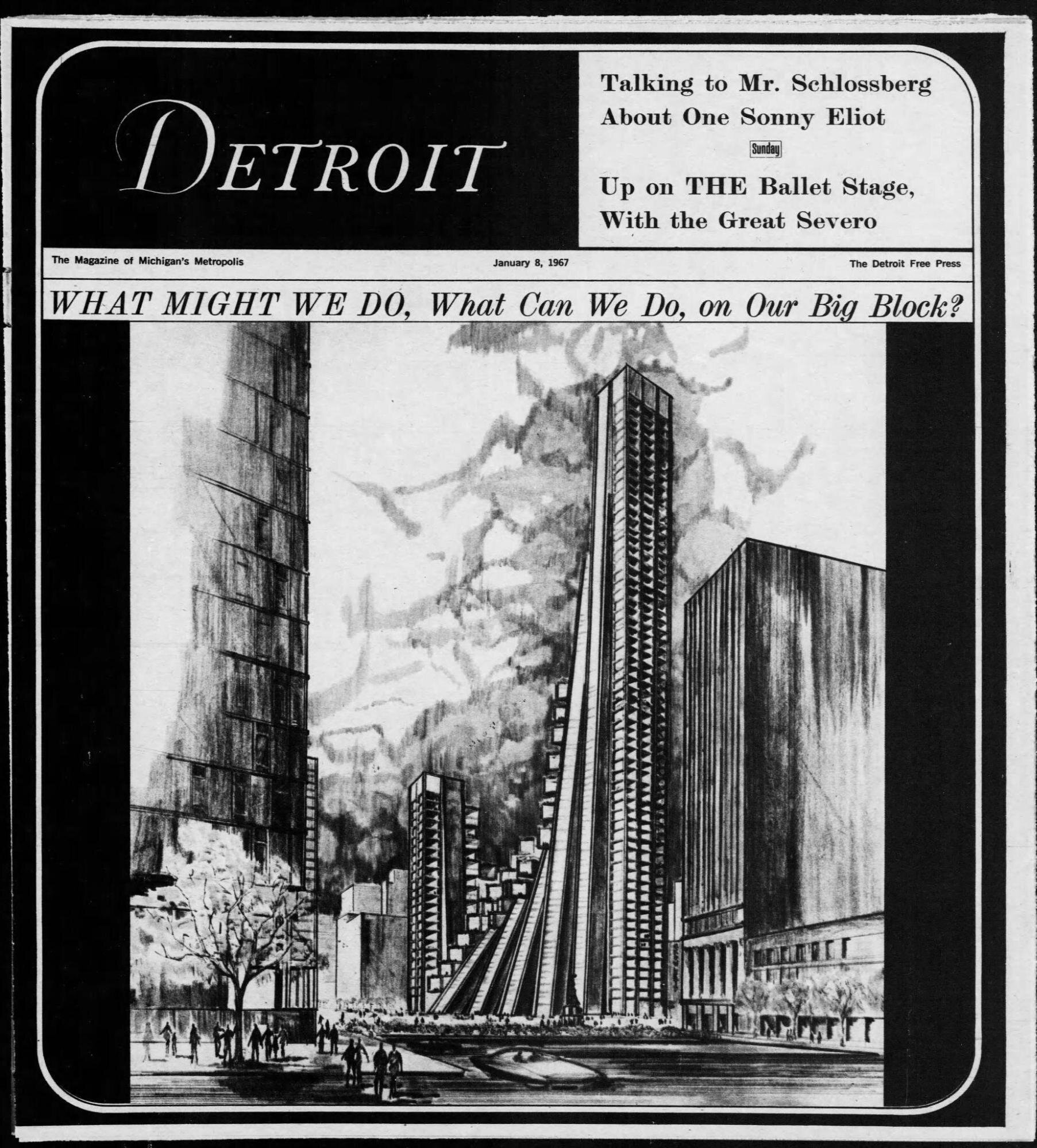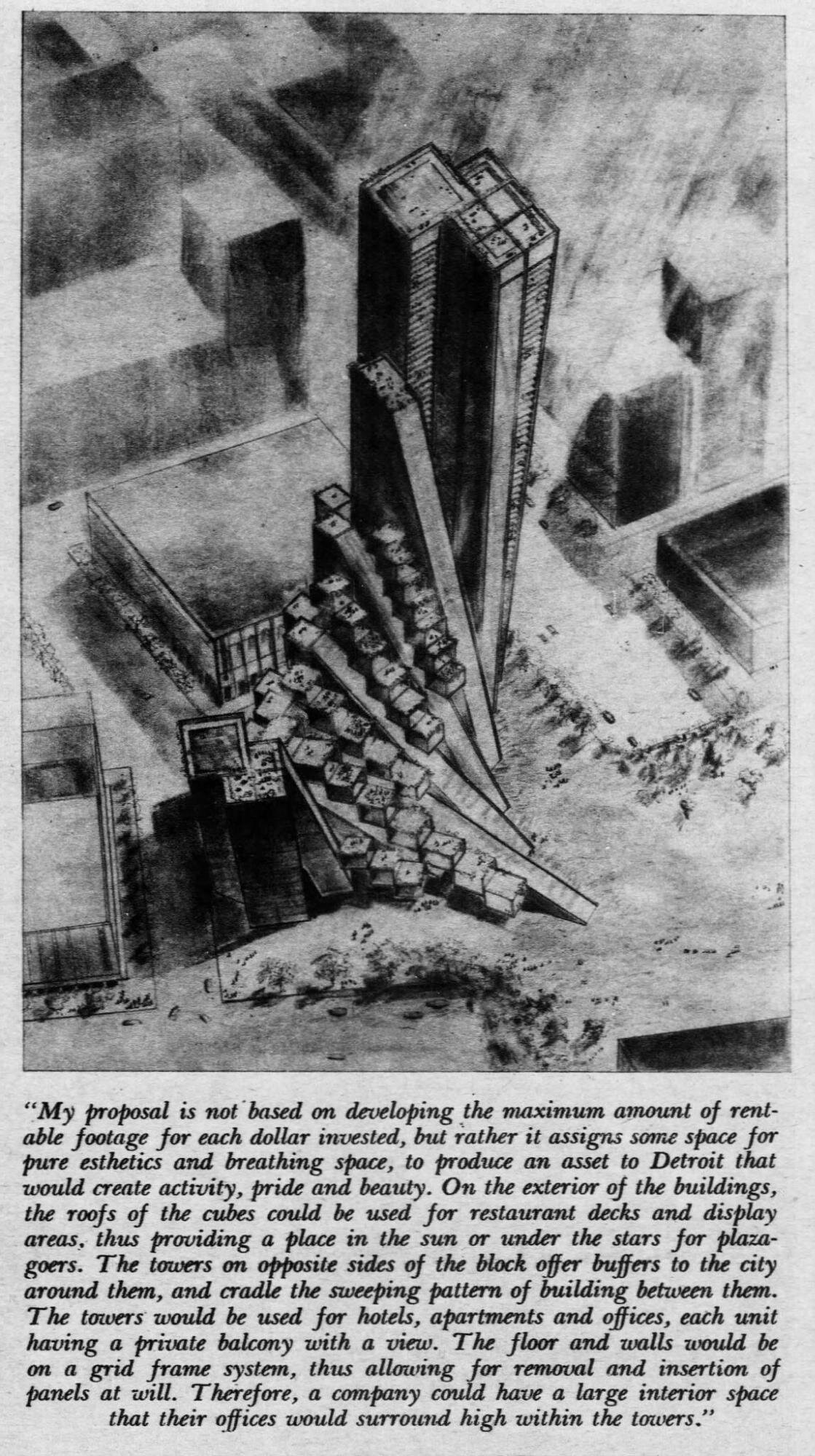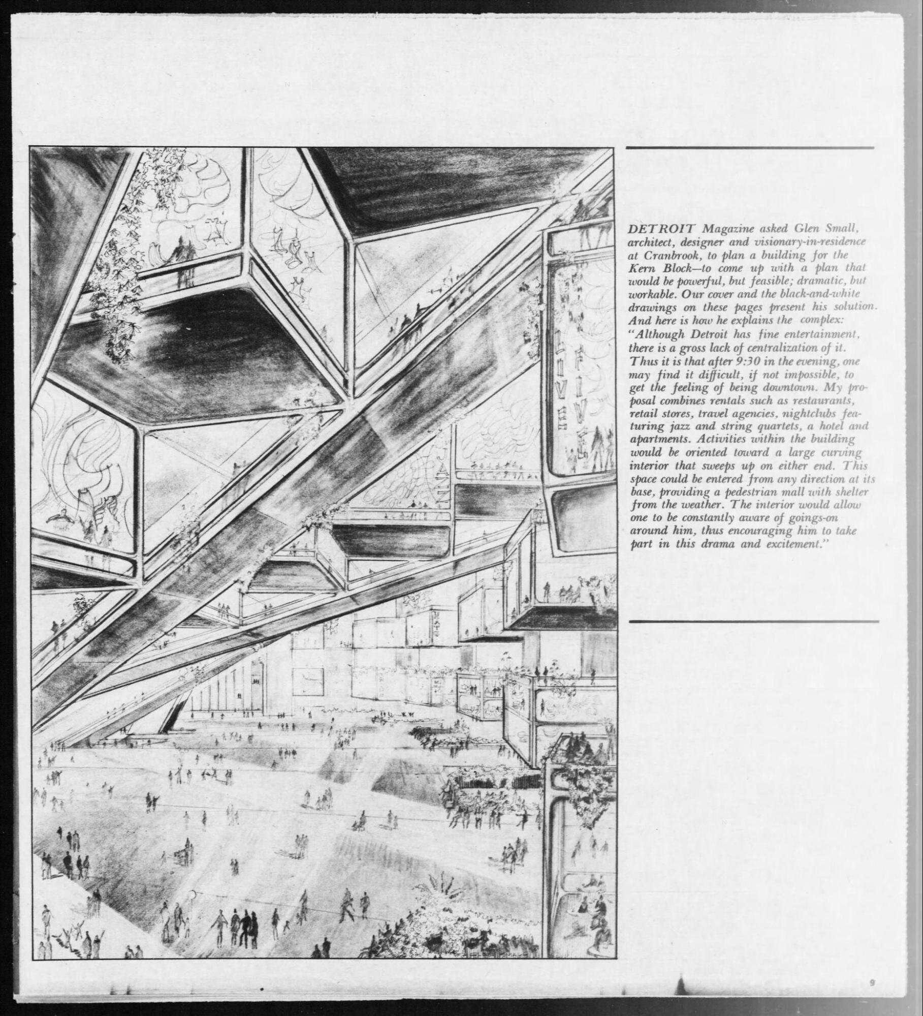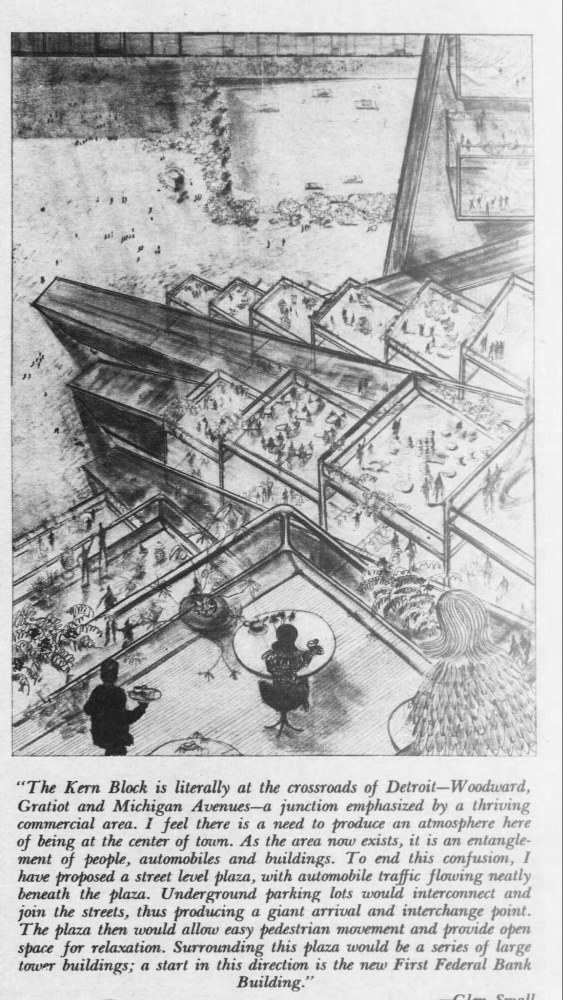Less than a year later, Detroiters were already sick of what the Detroit Free Press Magazine described as a “massive mudhole.” The Magazine commissioned 29-year-old Glen Small to develop a plan for the site. Small, a Cranbrook-based architect, developed a plan which he called “The Kern Block,” a play on the geography of building (a block) and its design (a series of stacked blocks). Obsessed with the idea of the “vertical city”, Small believed that the environmental concerns of an industrial city could be alleviated by bringing the activities of urban life off the street and into a towering building.