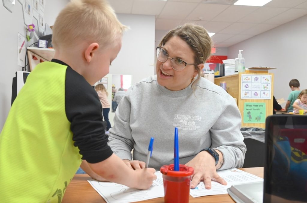 Ms. Amber works with a child at the Learning Zone Preschool and Childcare in Battle Creek.