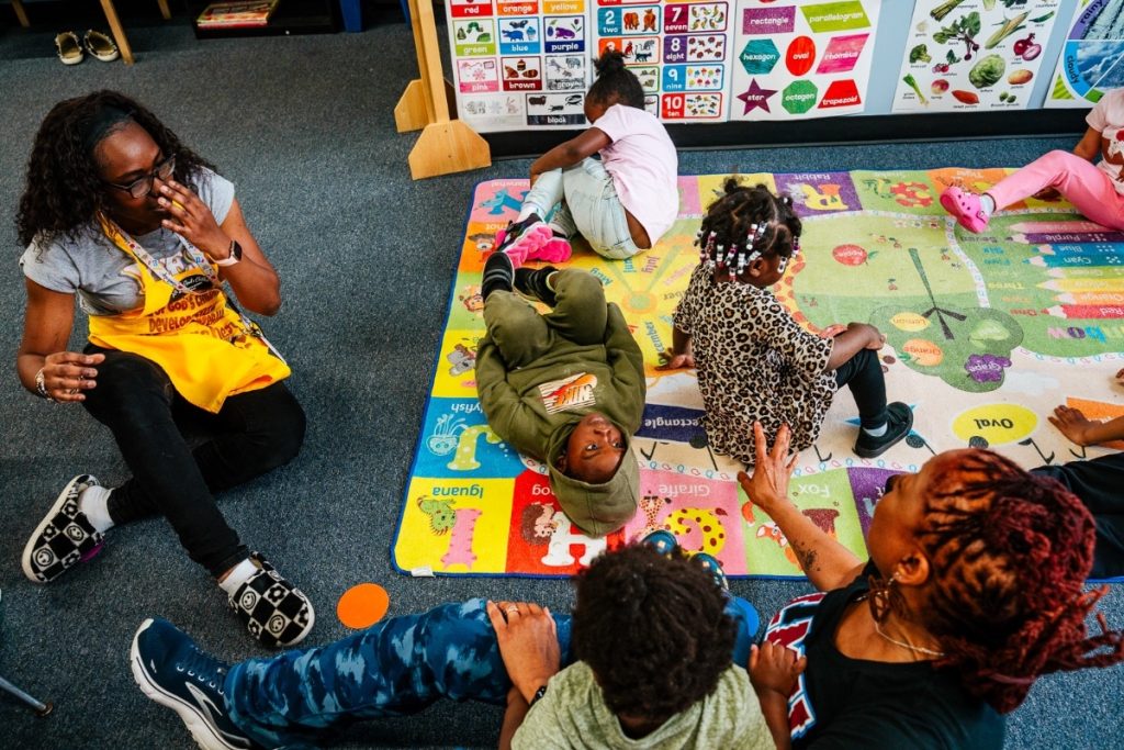 Teacher Kimberli Boyd leading music and movement at All Gods Children Developmental Learning Center in Detroit.